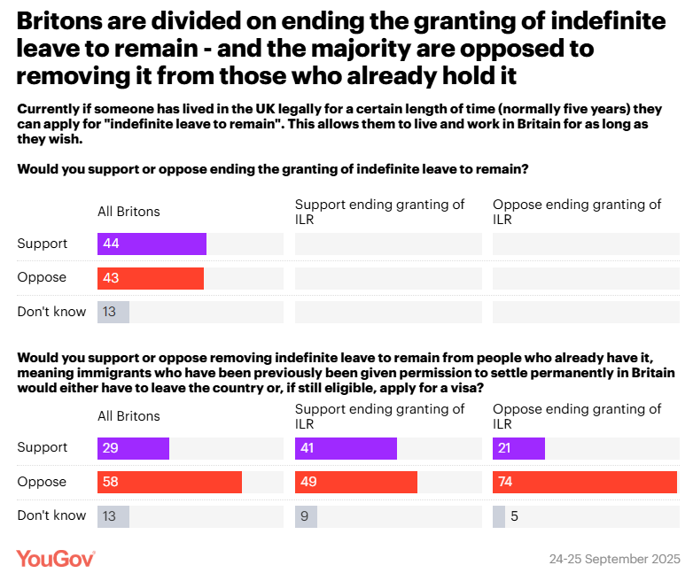 Sure, Britons were split around 44:43 regarding supporting vs opposing the granting of indefinite leave to remain in general (13% ‘don’t know’). This is presumably looking forward to future applicants.